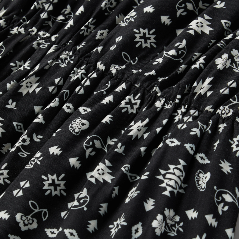 See pilkupüüdev keskmise pikkusega tõmblukuga kleit on kootud 100% viskoossest toimsest ja sellel on kõikjal edelapoolne ditzy print. sellel on v-kaelusega püstkrae, elastse vöökoha all on kokkutõmmetega sirge seljaosa, elastsete kätistega pikad varrukad ja küljeõmblustaskud.