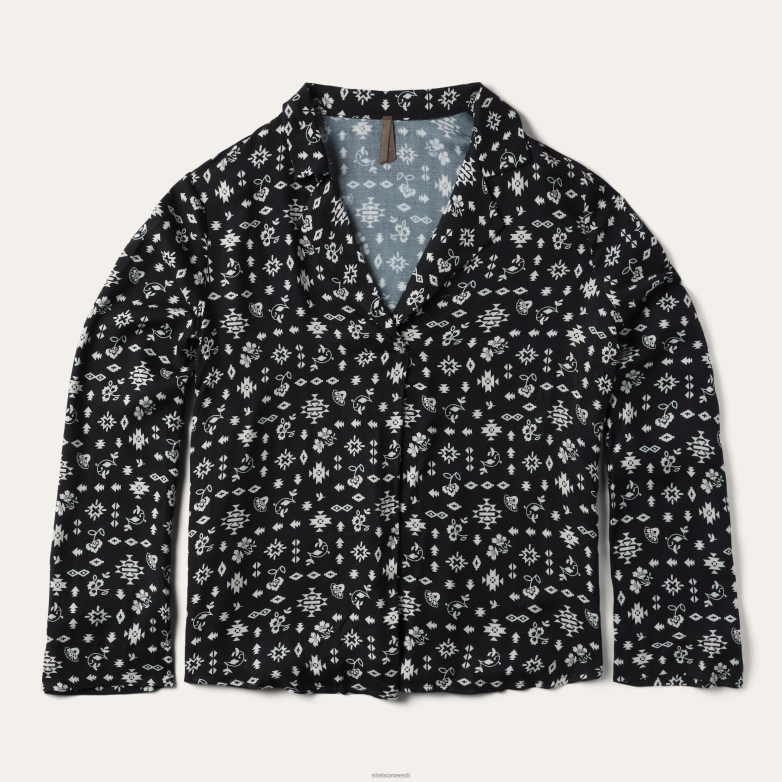 See pullover-pluus on valmistatud 100% viskoossest toimsest ja sellel on kõikjal edelapoolne ditzy print. sellel on V-kaelusega lahtise sälguga krae, pikad varrukad, millel on kerge kelluke ja ees keskel suur volt.