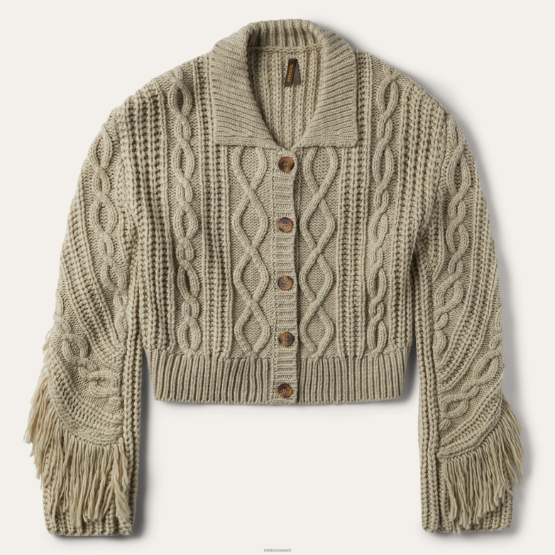 Sellel hubasel villaseguga trossiga kootud kampsunil on pehme pruunikaspruun värv, ees on nööpkinnis ja stiilsed äärised tagaosas ja varrukatel. vööpikkusega, pikemate, lendlevate varrukatega, pakub see teksadega kandmisel lihtsat elegantsi või riietumisel pisut boheemlaslikku hõngu.
