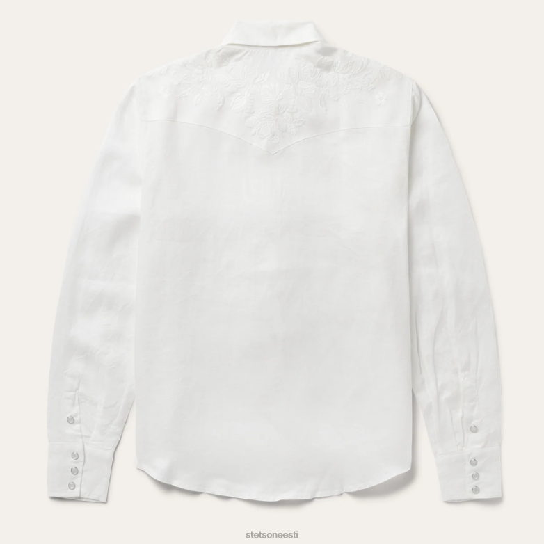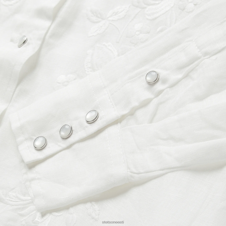 See kaunis valge toonitriibuline linane pluus on valmistatud kargest jahedast 100% linasest ja sellel on keerukas toonis tikitud lilleline detail, mis täiustab selle klassikalist läänest inspireeritud stiili. Kaasaegsel siluetil on langetatud õlg ja sirge voldiga seljaosa ning see on viimistletud ühe nööbiga kätistega ja kumera alläärega. kerge ja hingav pluus on lihtsa elegantsiga, mis sobib ideaalselt sooja ilmaga igapäevaseks kandmiseks.